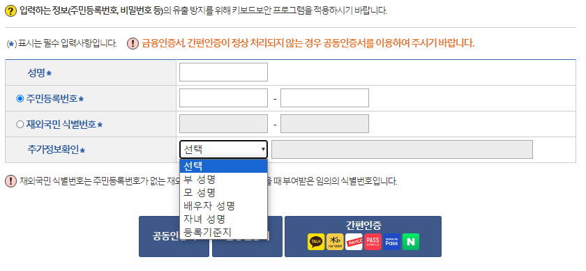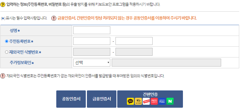- 공동인증서 또는 간편인증으로 본인 확인
