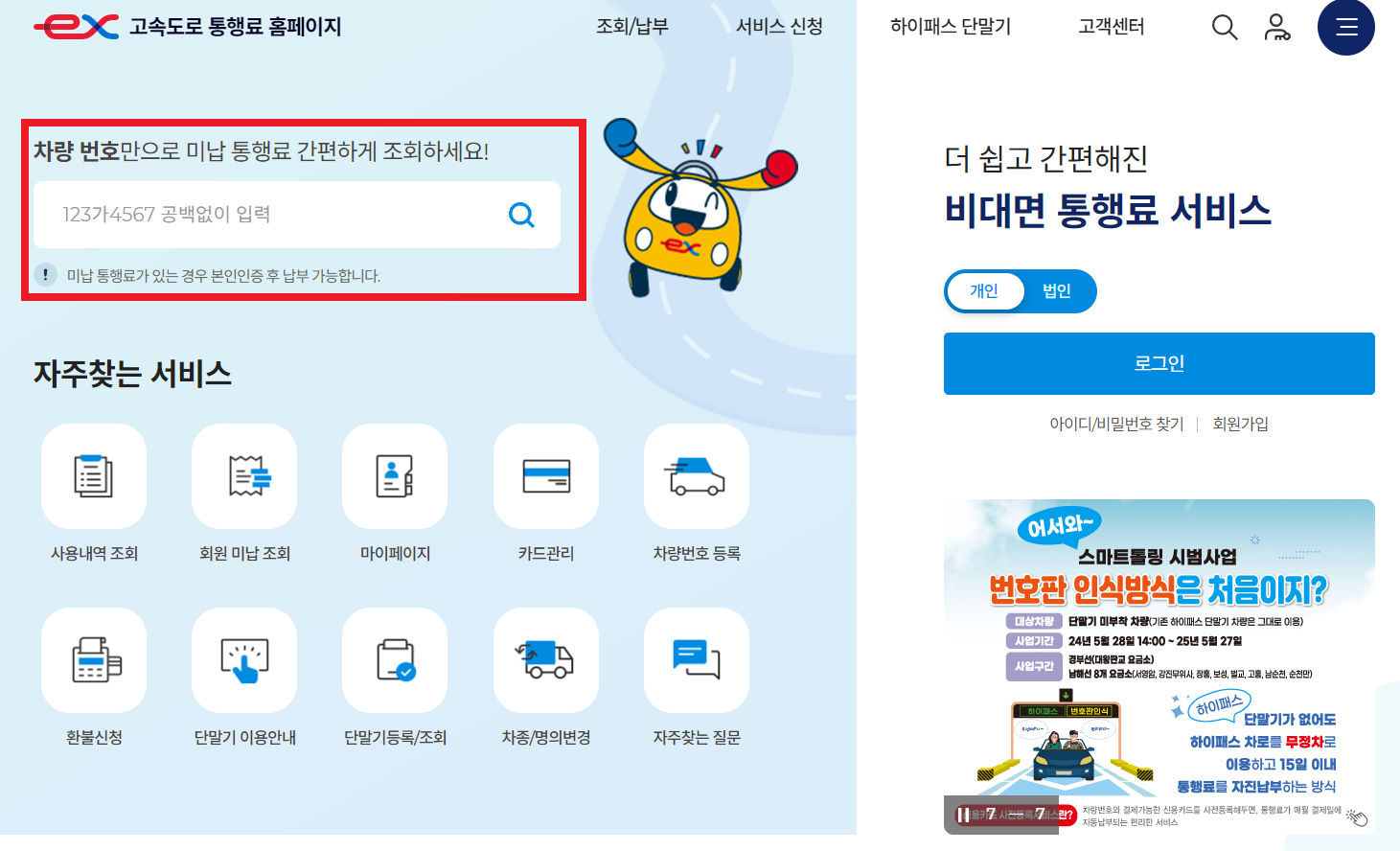 차량번호, 본인 인증 후 고속도로 통행료 미납조회 및 납부 가능 - 한국도로공사 통행료 서비스 홈페이지