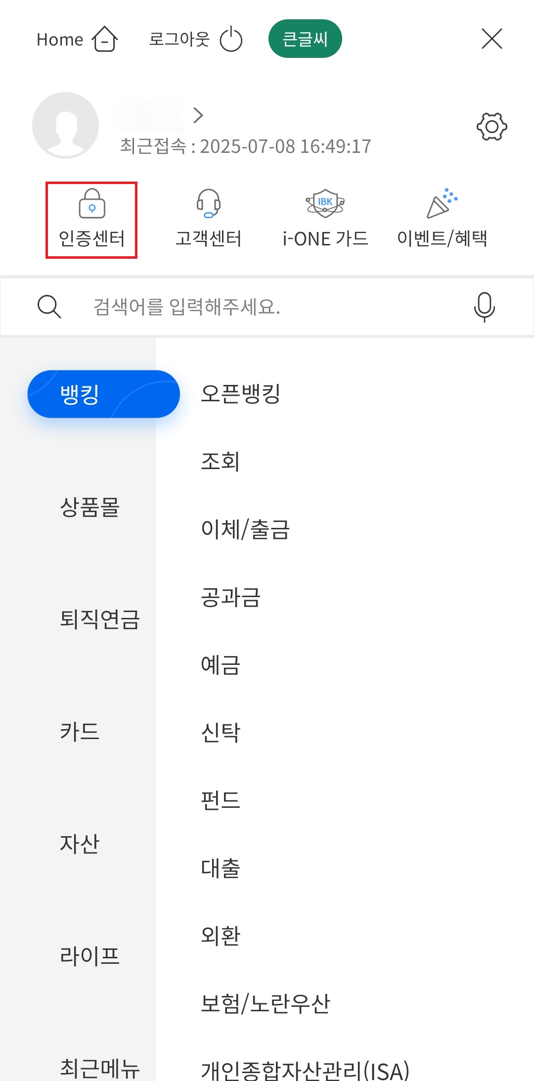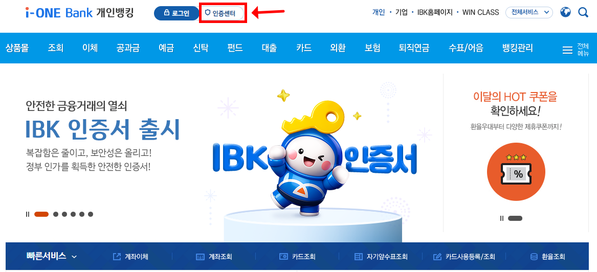 - ‘개인뱅킹 로그인’ 후 상단 메뉴 ‘인증센터’ 클릭