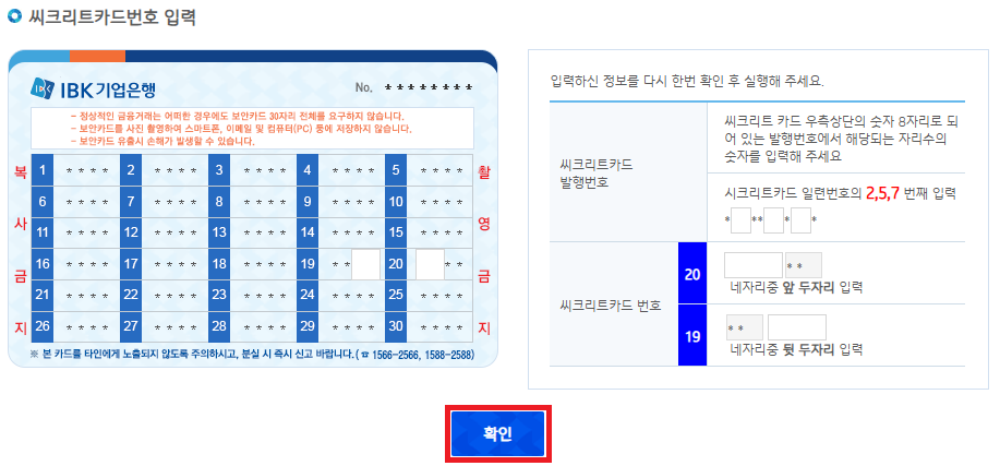 - 씨크리트카드나 OTP 번호 입력