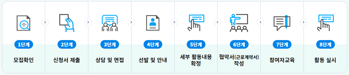- 절차: 기관 방문 → 신청서 제출 → 상담 및 면접 → 최종 선발