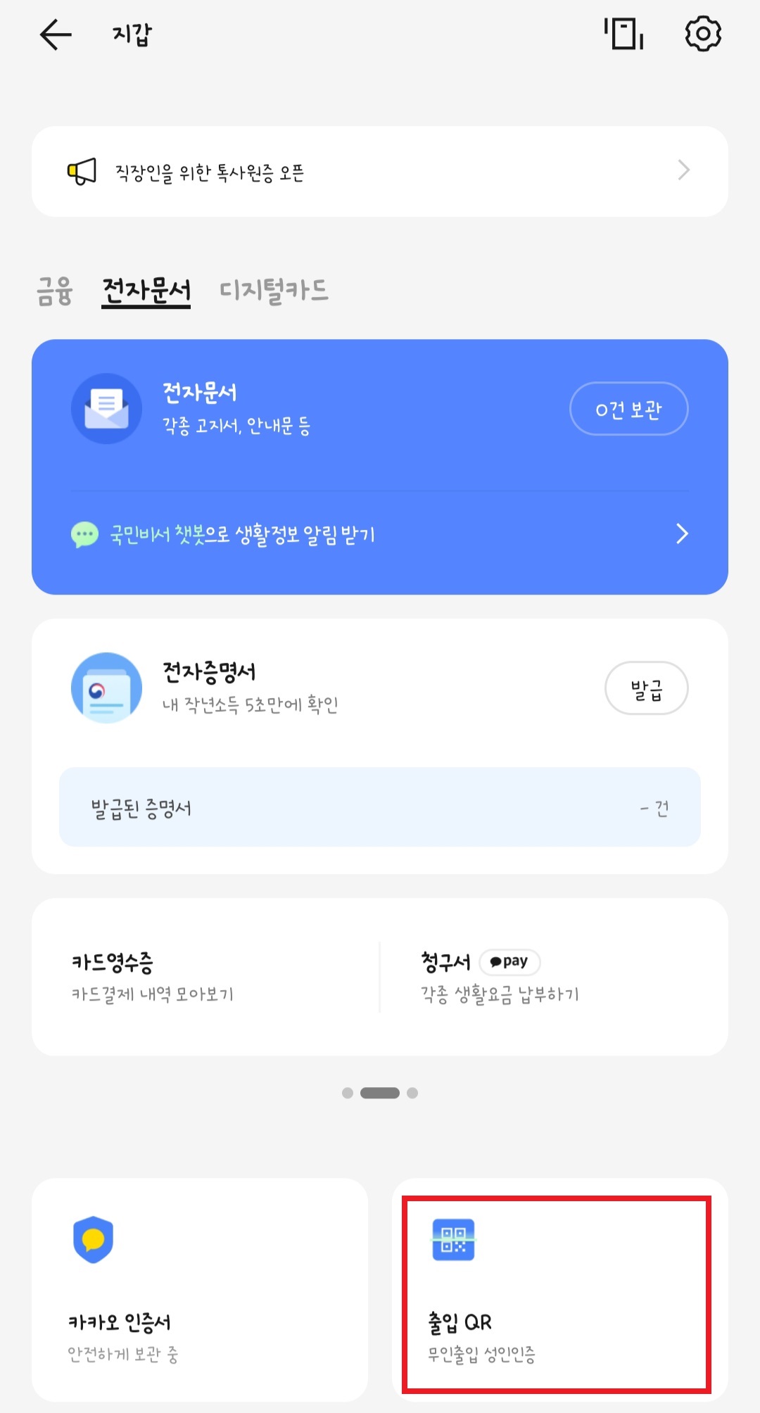 - 카카오톡 실행 → 더보기 메뉴 > 전자문서 지갑