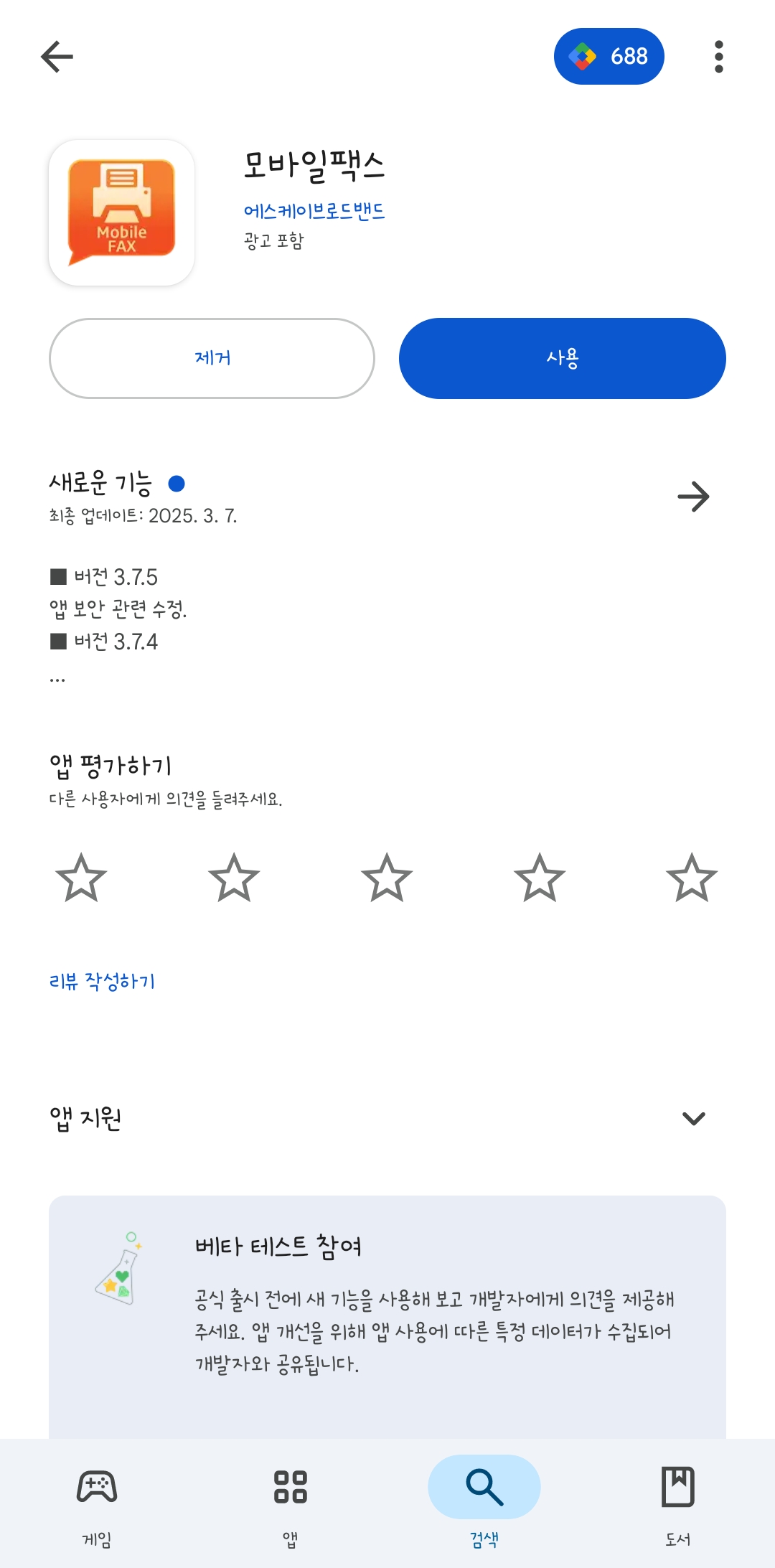- 구글 플레이스토어 또는 앱스토어에서 ‘모바일팩스’를 검색해 설치
