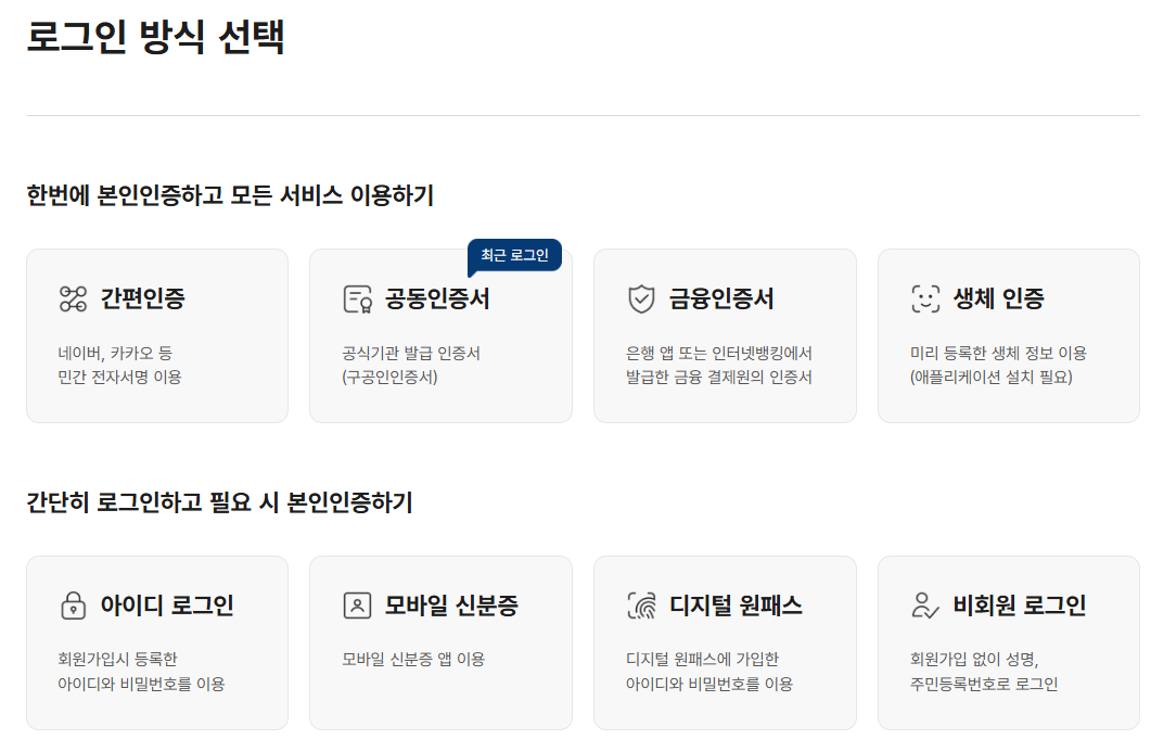 - 공동인증서, 금융인증서, 간편 인증 중 선택