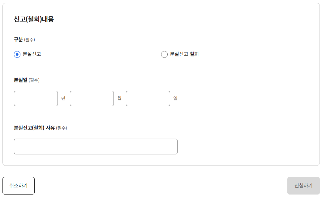 - 본인 인증 후 분실신고서 제출
