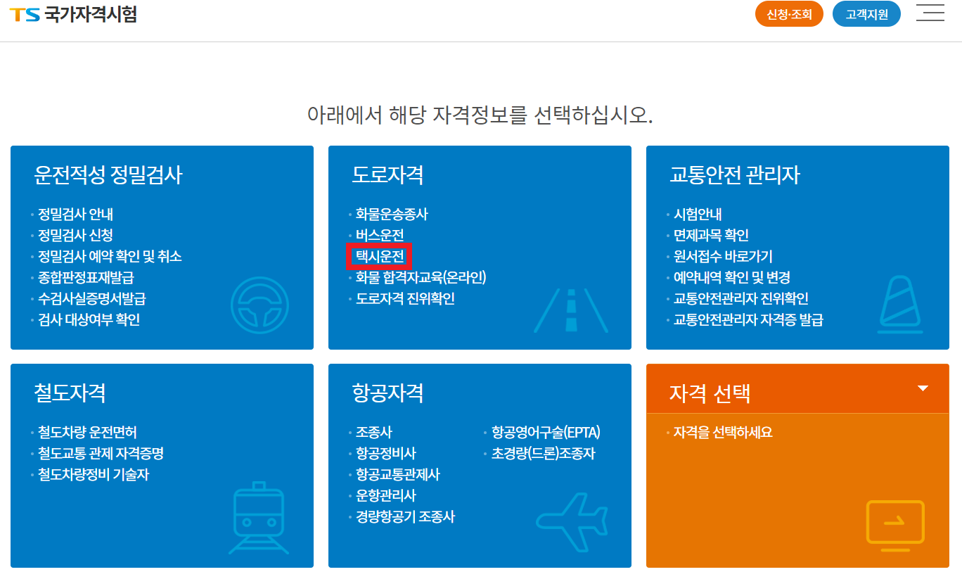 1. TS국가자격시험 홈페이지 접속 → ‘택시운전 자격시험’ 원서접수