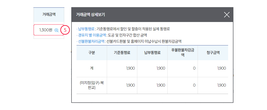 거래금액 옆 돋보기 클릭 시 상세 내용 확인 가능