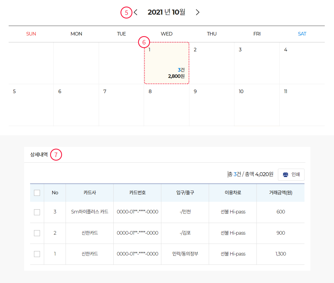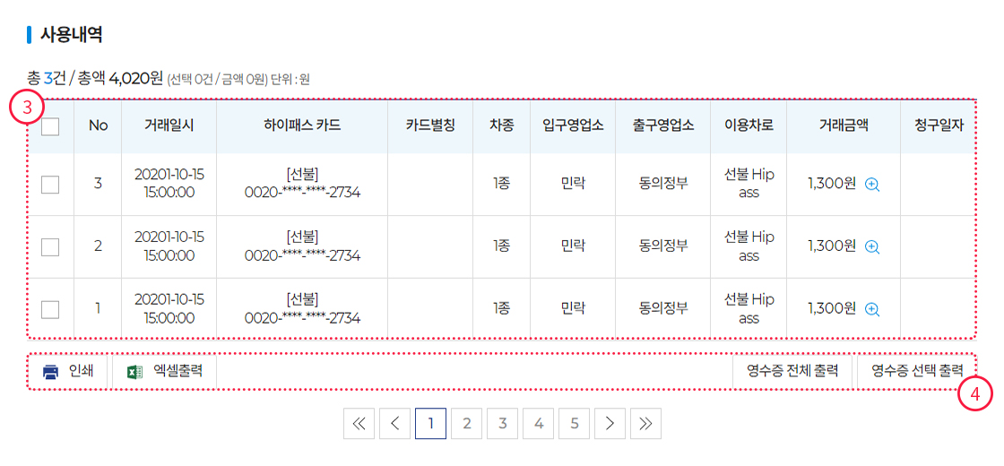 조회된 하이패스 사용내역은 아래 방식으로 출력할 수 있습니다.