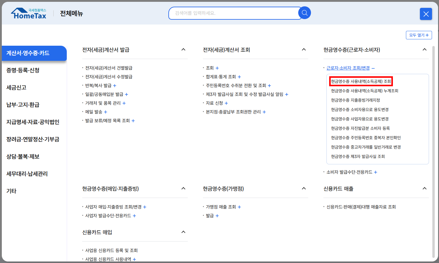 - 메뉴: [계산서·영수증·카드] → [현금영수증(근로자·소비자)] 선택