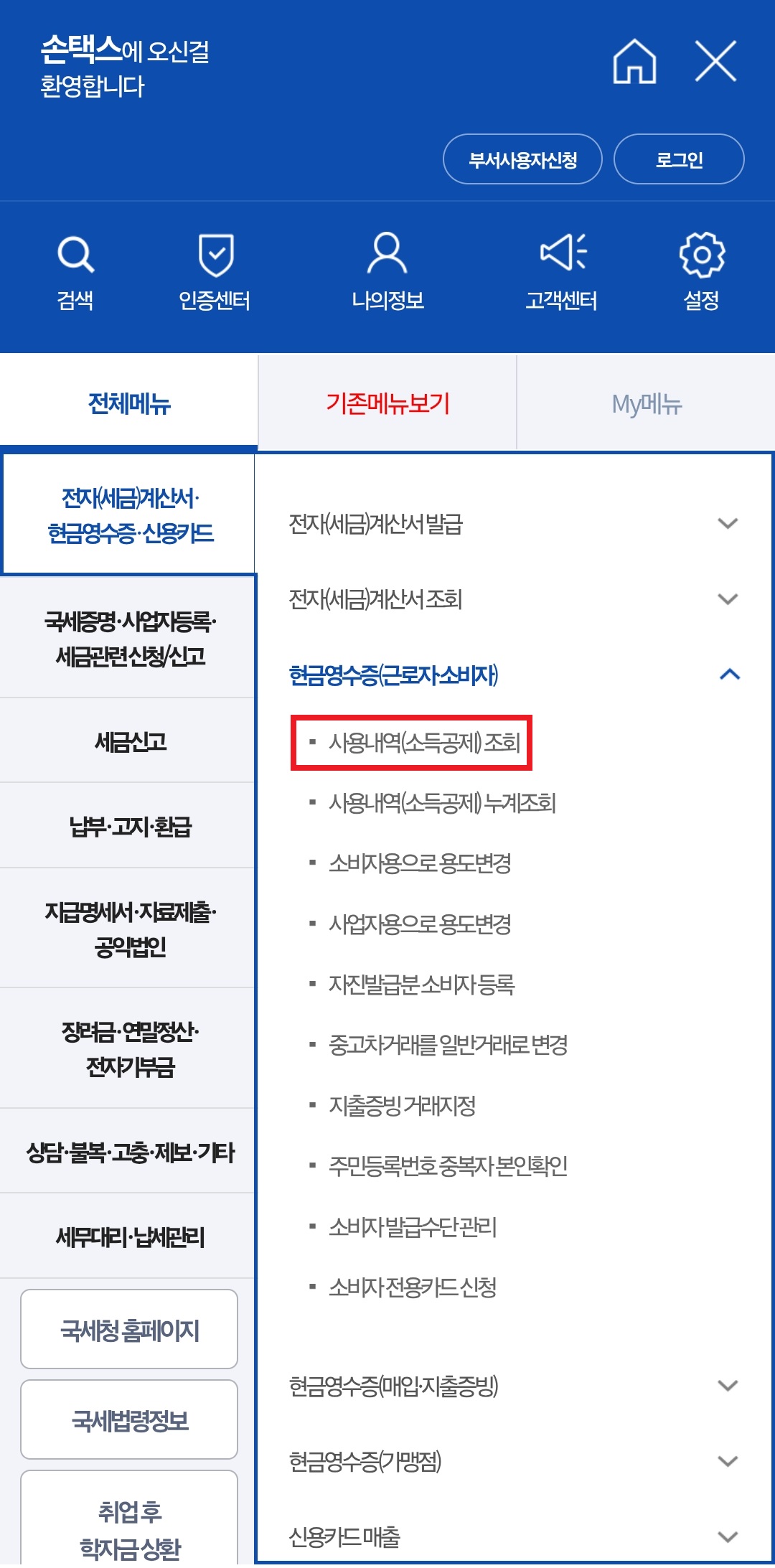 - [현금영수증(근로자·소비자)] → '사용내역(소득공제) 조회'